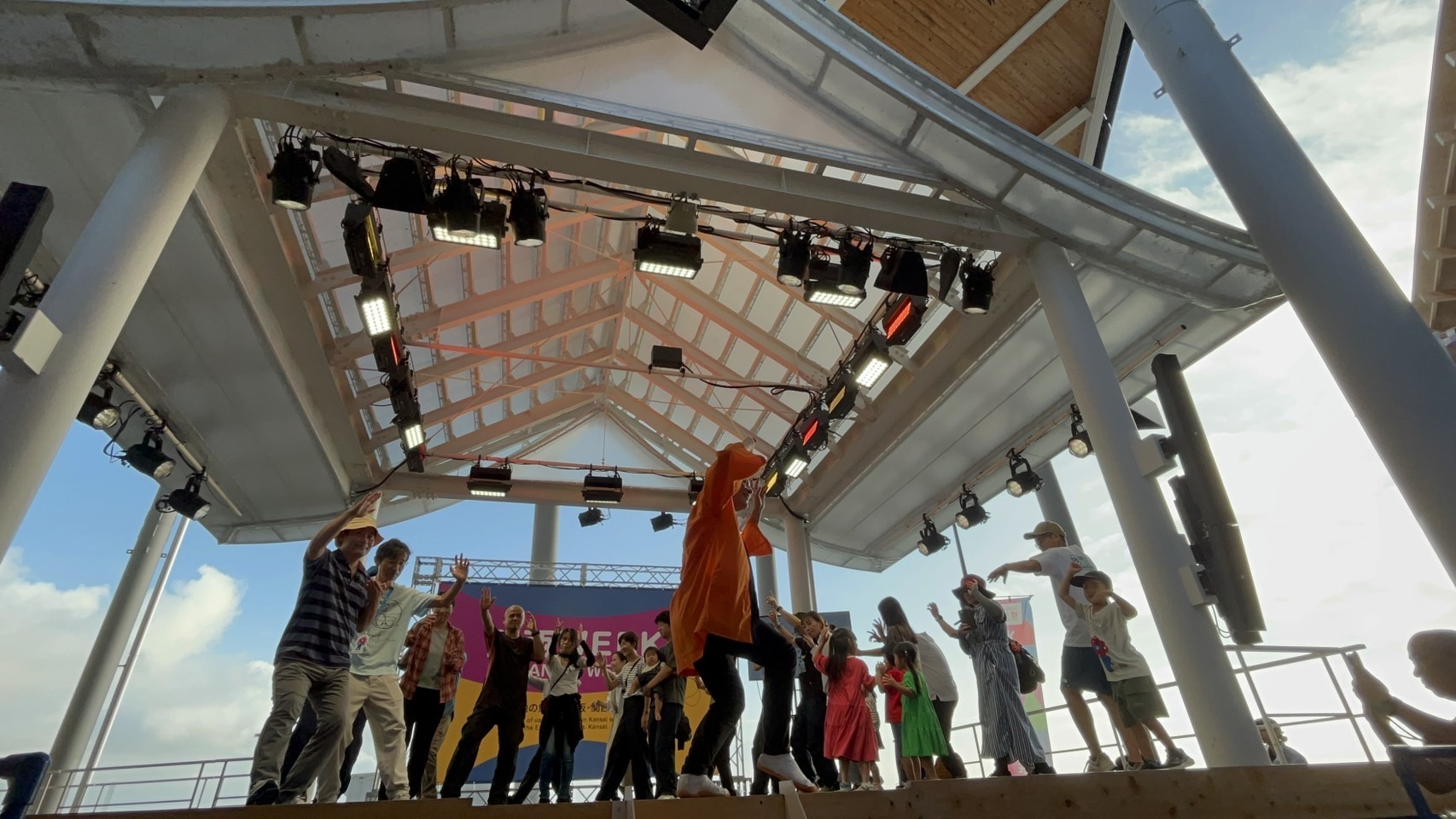 後半は、実際の祭り体験で、阿波踊りをレクチャーに、観客のみなさんに舞台に上がってもらい一緒に輪になって踊ったりと、一体感と活気溢れる場となりました。